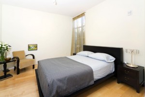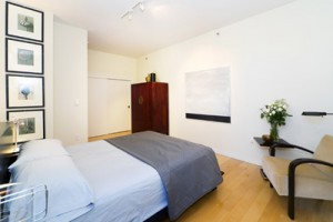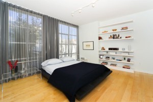 The light-filled master bedroom suite features a wall of floor-to-ceiling windows accented by custom Donghia Laser Scrim drapes providing a shimmering metallic accent to compliment the building¿s unique architectural design. A wall of custom-built floating shelves, beautiful hardwood floors, track lighting, a large walk-in closet and a master bath appointed with travertine, emperador marble and accenting tiles complete the sleek accents to this room.