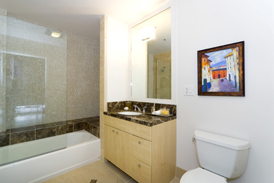 A hallway with skylight, perfect for display of your fine art, leads to a guest bath with shower over tub appointed with tiled floor, maple and granite vanity and custom accents. A separate hall closet features in-unit Bosch washer/dryer and ample storage.