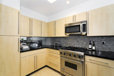 The open and spacious living dining area features a custom designed corner gas fireplace with hand-picked Brazilian alpine white slate tiles, custom window treatments and track lighting, and opens to a sexy Chef¿s kitchen fully equipped with black granite counters, custom maple cabinetry, stainless appliances including a Viking 30″ open burner gas stove, Bosch dishwasher and microwave, trash compactor, Jado Glance faucet and GE Profile side-by-side refrigerator. The kitchen is accented with a beautiful surround of Ann Sachs Erin Adams Zen weave individually cut glass mosaic tiles adding a warm, creative aesthetic and wealth of color.