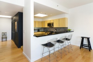 Enter this light-filled unit through a formal foyer with custom Zebrawood base niche to enjoy the 9 foot ceilings, skylights, and beautiful wide-plank maple floors. Step into the living room to enjoy the serene southern views of the City from the floor-to-ceiling windows framed by the unique stainless “Moon Gate screen” ,an architectural feature of the 1600 Webster building designed by Don Rich Studios.