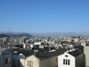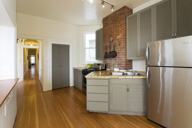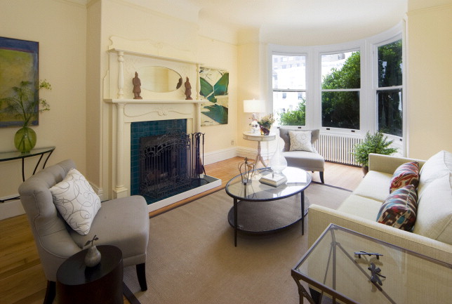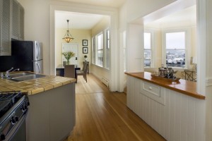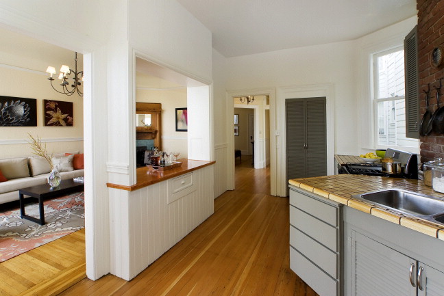 A sunny rear parlor, featuring a wood burning fireplace, opens to the spacious kitchen and adjacent dining room and is perfect for entertaining. All three rooms have stunning southern views of the City and Twin Peaks. The kitchen features tiled counters, stainless appliances, ample cabinetry and a separate pantry with in-unit laundry.