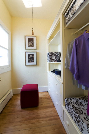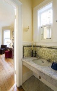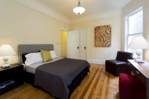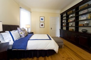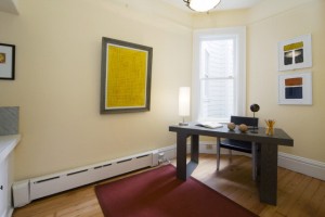A gracious entry foyer with vintage stained glass welcomes you into a formal double parlor featuring bay windows with curved glass, a wood burning fireplace, high coved ceilings, and beautiful refinished floors. A north facing bedroom with an original marble sink/vanity completes the front of the unit. Two spacious bedrooms are central to the unit with adjoining updated tiled bath with pedestal sink, shower over tub, custom cabinetry and ample closets. Two large walk-in closets, a powder room, and a fourth bedroom/office are accessed by the central hallway, which features vintage moldings and wainscoting and is a perfect spot to display your art!