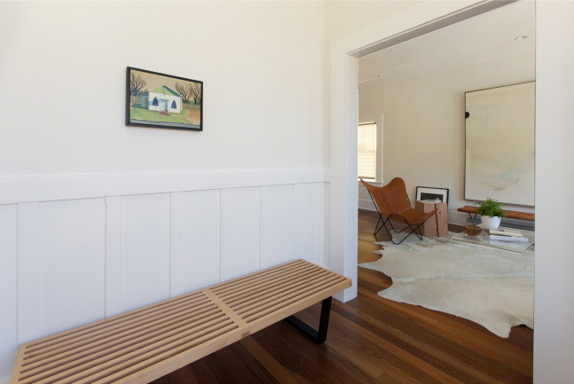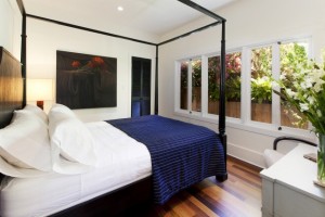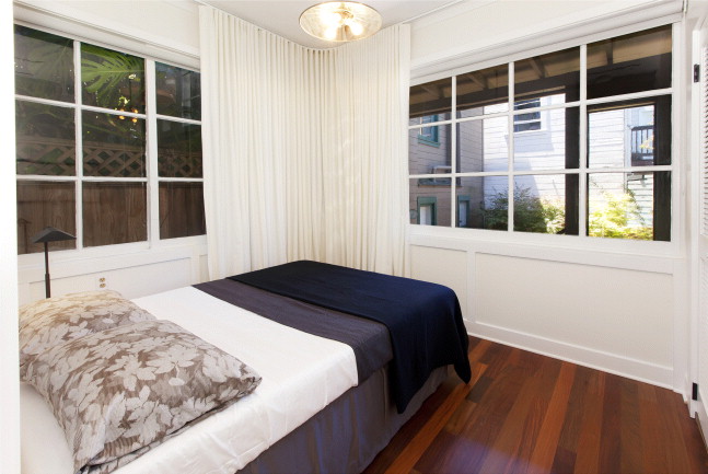 Two bedrooms are tucked away from the main living area and provide a quiet respite from city living. The front bedroom features a wall of windows, providing calm outlook and natural light throughout the day. The rear bedroom overlooks the tranquil backyard and is graced with custom drapery and large windows along two walls. The spa-inspired bathroom is flooded with light from a large, operable skylight, and features a double vanity with marble counters, stone tiled floors and a large stone-tiled shower.