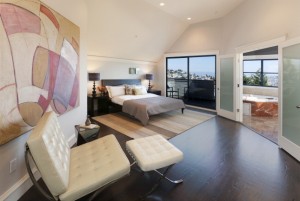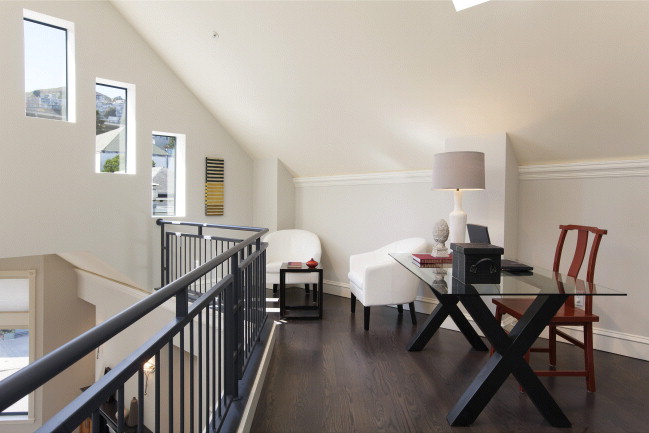 The Upper level features a light-filled loft area overlooking the living room perfect for home office. A large master suite appointed with custom walk-in closets and direct access to an east-facing deck, plus a luxury master bath with panoramic views of the City and East Bay, complete this level.