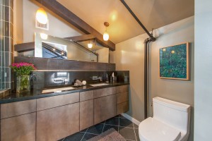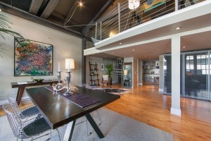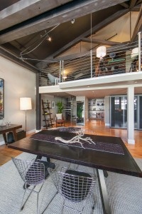 The main level features an open floor plan of living and dining, flowing into the kitchen and hallway, with soaring ceilings, exposed brick walls, authentic timber beams, beautiful refurbished hardwood floors, and an east-facing wall of original Palladian wood windows. Perfect for the professional or at home chef, the kitchen design features designer cabinetry with granite countertops, custom lighting, stainless appliances, and a separate pantry. A travertine entry and bath with cast concrete sink and shower over tub complete this level.