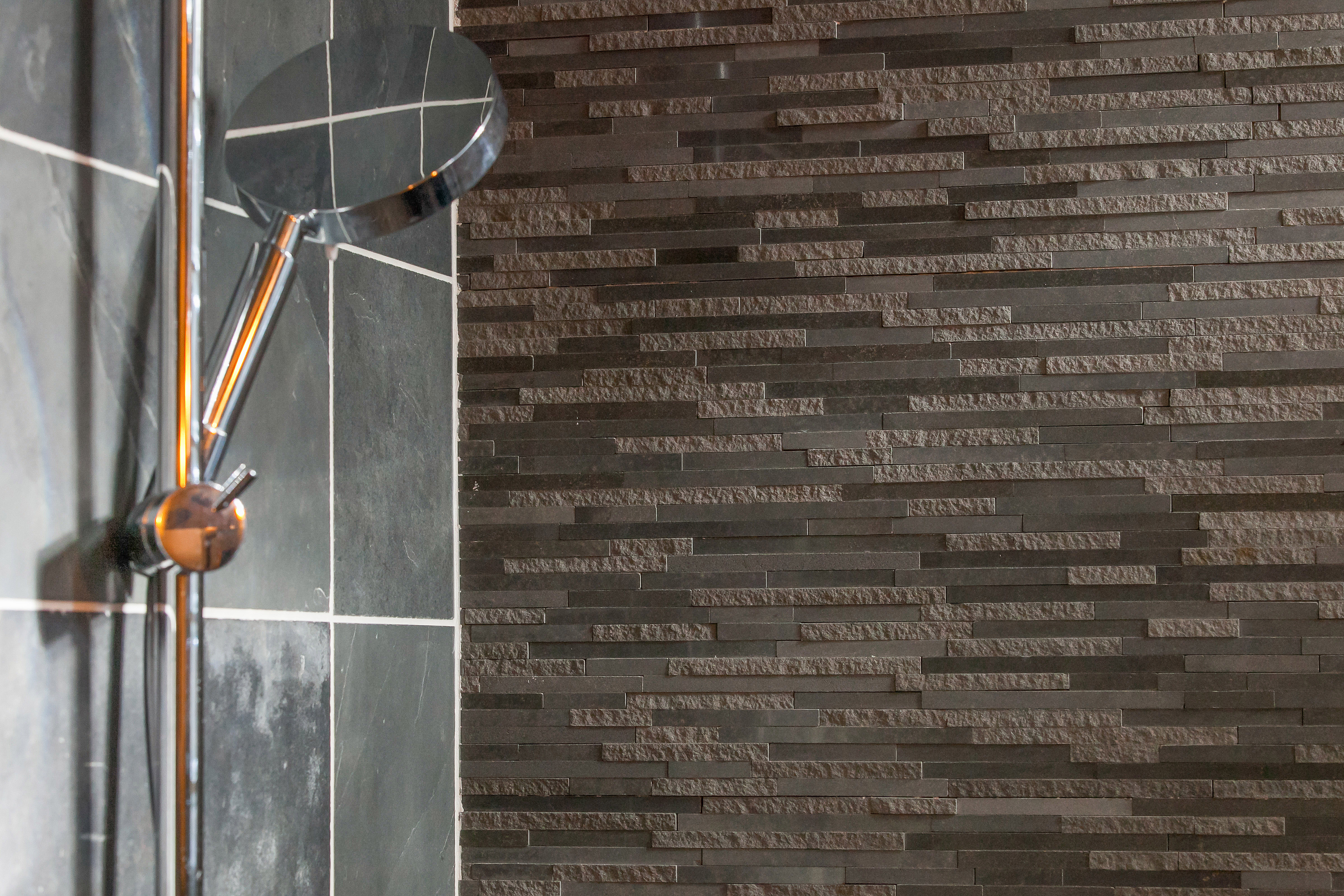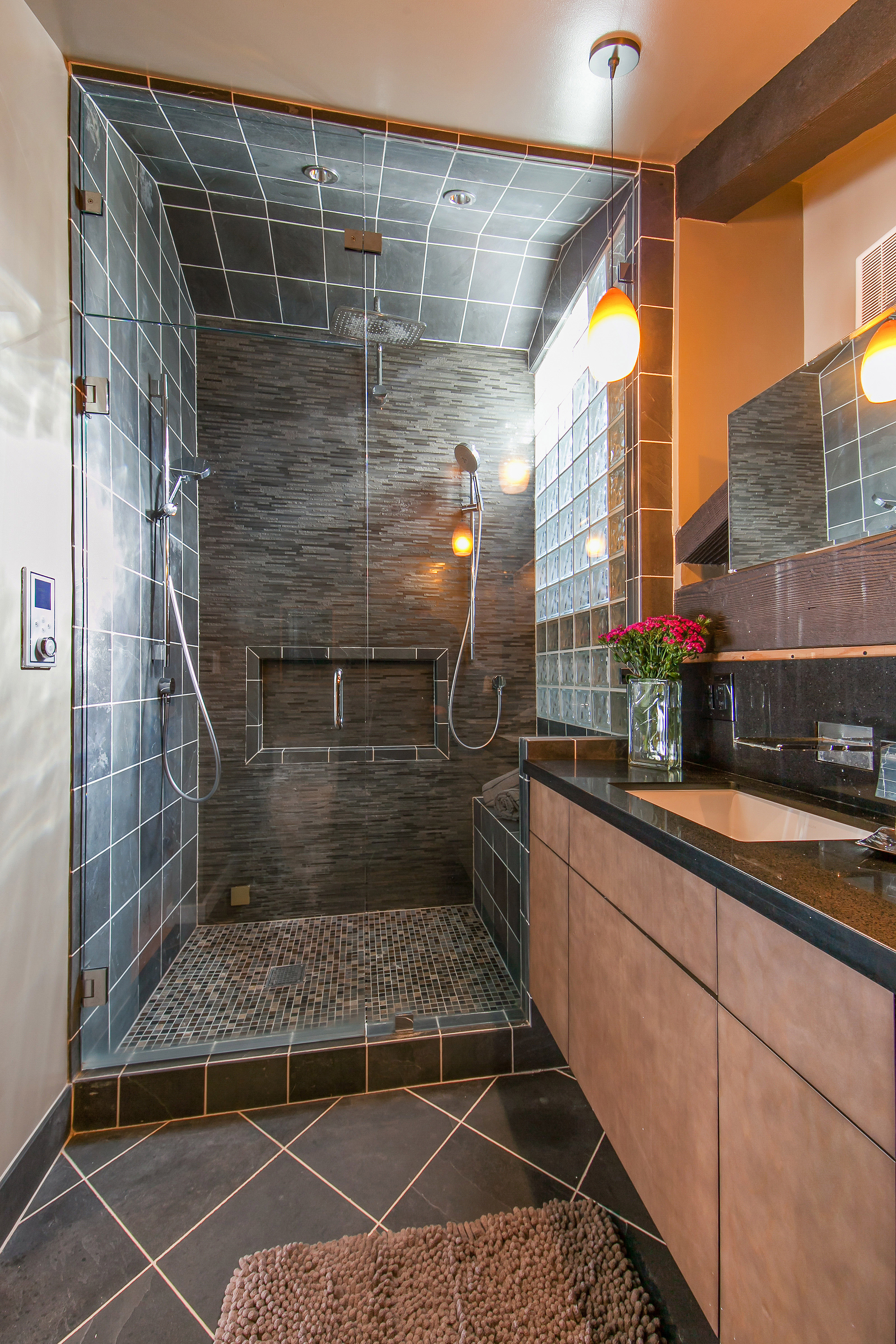 A spiral staircase leads to the upper loft master suite featuring custom wardrobe, lighting, and a spa-like en-suite master bath with double vanity featuring Boyi Modern LED Waterfall Faucets, and large walk-in steam shower by Michele Magowan Design.