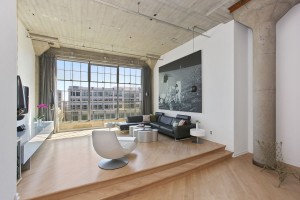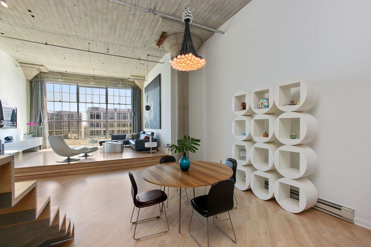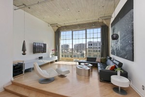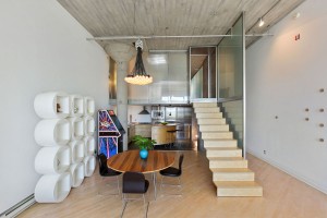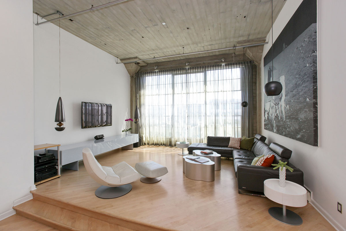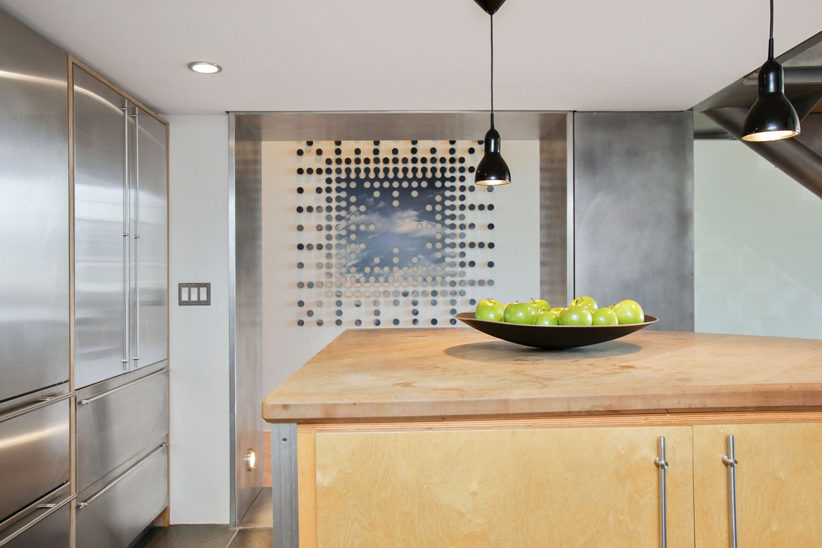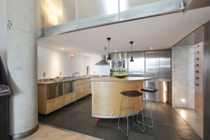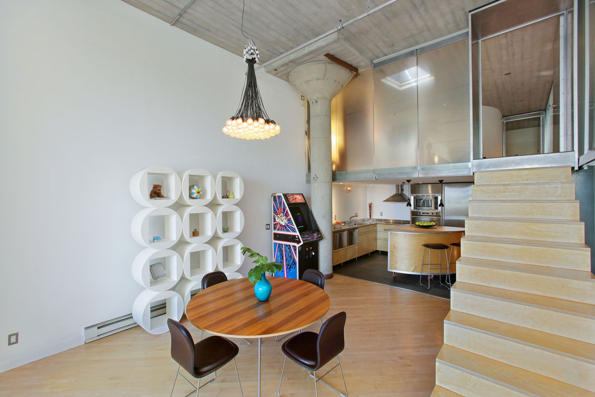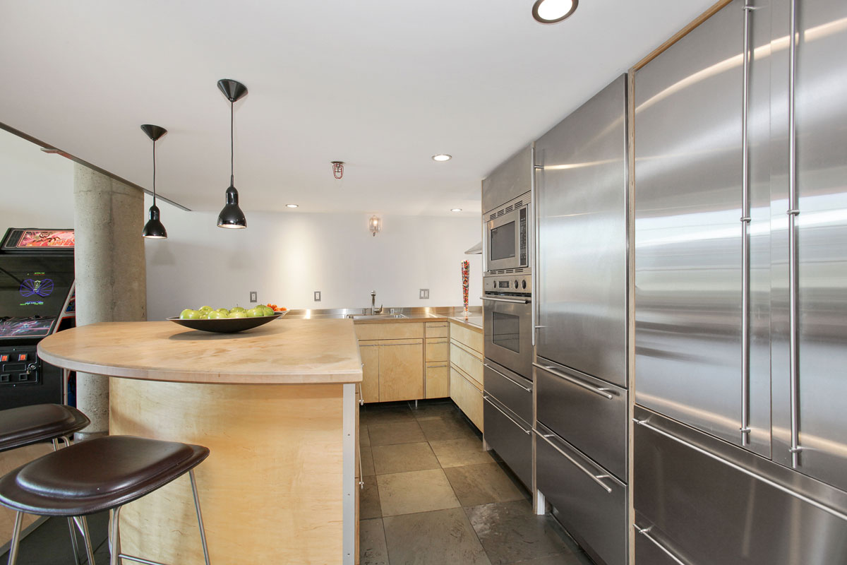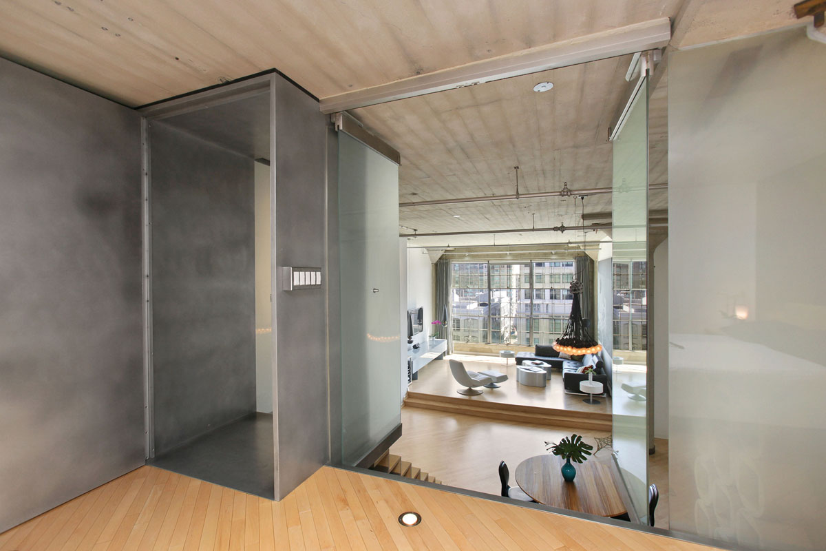 The main loft is an open floor plan of living and dining flowing into the kitchen and hallway, with 14 foot ceilings and a south-facing wall of windows overlooking South Beach and the Bay. Perfect for the professional or at home chef, the kitchen design features custom open cabinetry with stainless countertops, slate flooring, recessed lighting, Sub Zero refrigerator, Fisher & Paykel dishwasher, Bosch oven, Dacor stovetop, and a moveable butcher-block-topped kitchen island. This level also features a generous studio or home office enclosed with double-hung walls to minimize sound transference. A slate bath with stainless fixtures and a bookcase backed in frosted glass, lend a practical livability to complete this level.