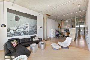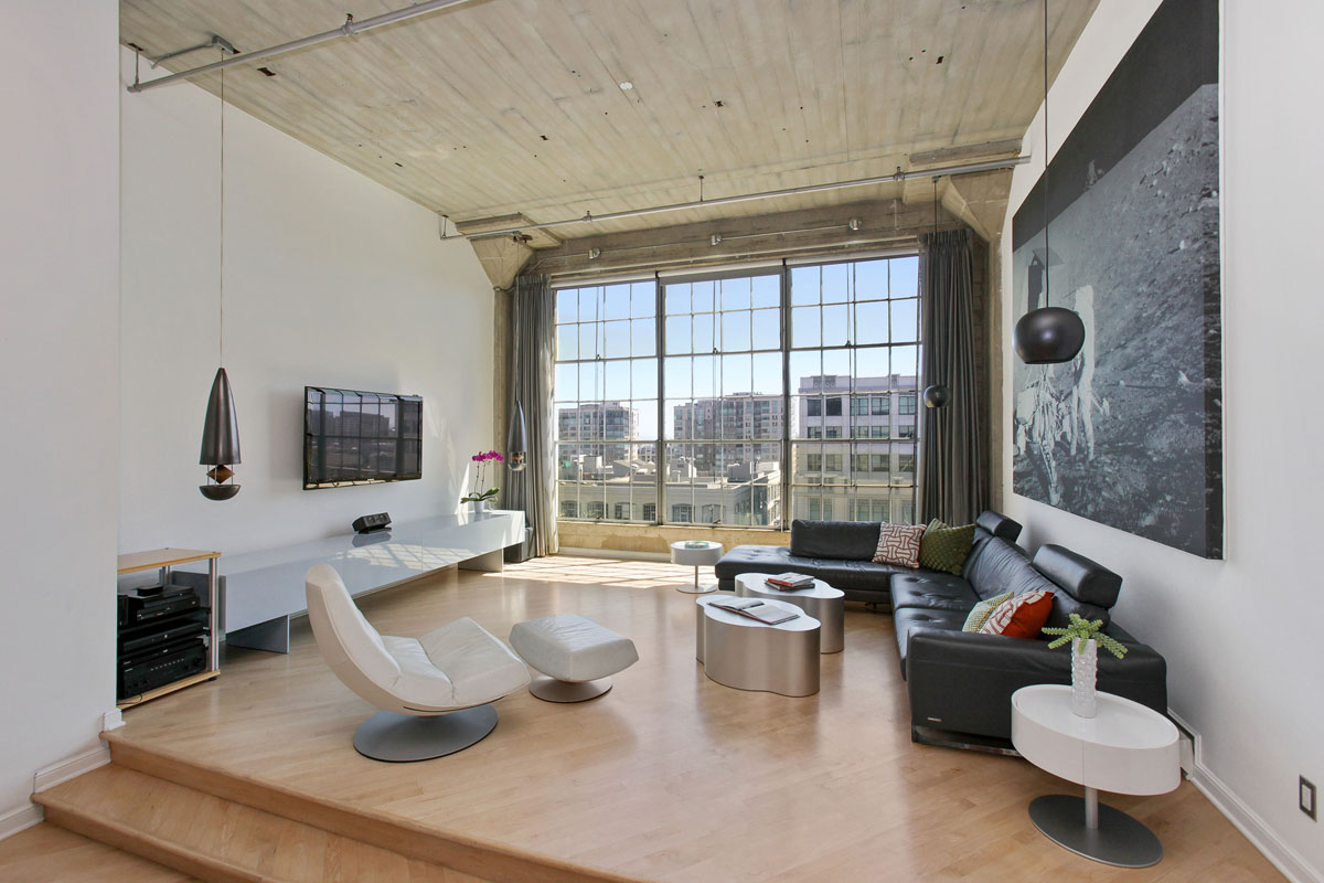 Other amenities include a dramatic Droog Design dining chandelier, stylish hanging home theater Zemi & Atun ceramic speakers, hardwood floors, two-car tandem parking, additional storage, as well as access to the building’s palm-tree lined courtyard, and a roof deck with views of San Francisco.