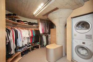 A floating staircase leads to the upper loft bedroom suite featuring a Rothko-inspired art wall, in-floor lighting, and a sweeping interior curved wall leading to the master bath with a free standing pedestal sink and walk-in shower adorned with iridescent glass tile, and an adjacent spacious wardrobe with custom built-ins and in-unit laundry.