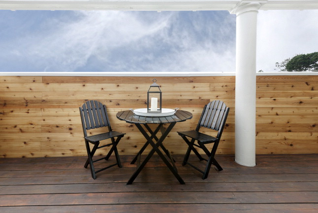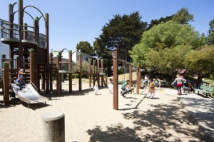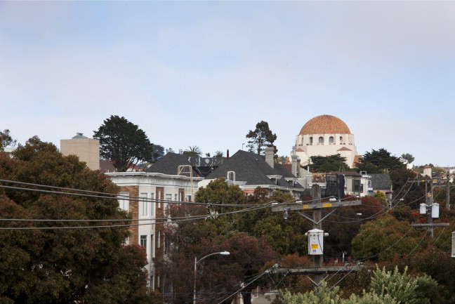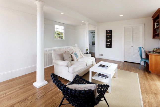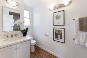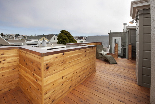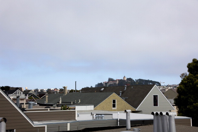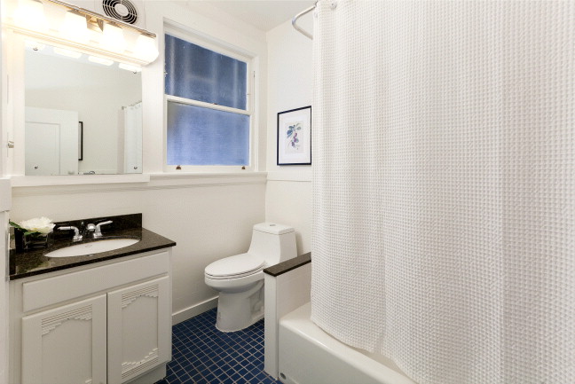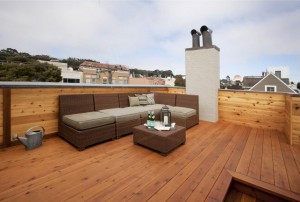 The gourmet eat-in kitchen is flooded with natural light that accentuates the new Carrera marble counters, stainless appliances and a great layout. Two good-sized bedrooms and one bath complete the main living level. The upper level features a master suite and family room, which opens through French doors to two roof-top decks. Both decks have views of the Presidio and neighboring homes and the east facing deck is quite large. A wall of custom built-in cabinetry complements the family room.
