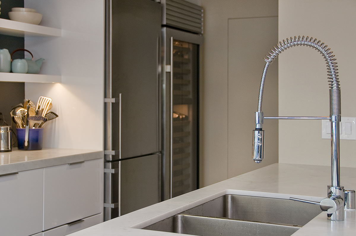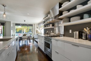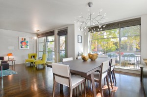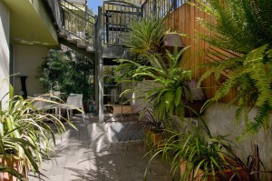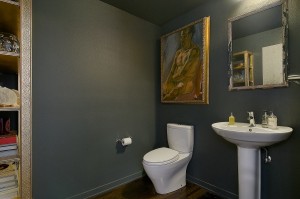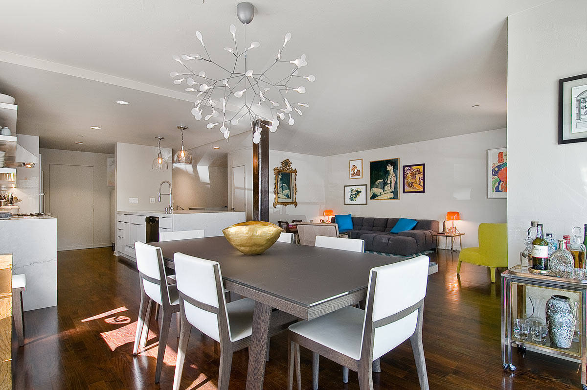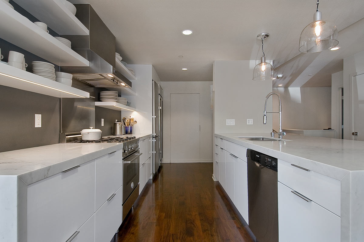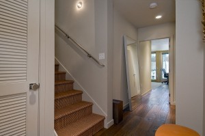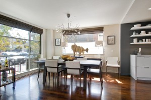 Enter into a tranquil living room with beautiful oak floors, an adjacent dining area graced with Moooi Haracleum pendant light and a renovated kitchen that would please any chef. Oversized windows on two sides fitted with The Shade Store window treatments give this townhome an inviting, house-like feeling. The chef’s kitchen combines beauty and function, with natural Carrera marble counters, custom cabinetry and open shelving with LED lighting, double stainless sink with Rohl faucet, Bertazzoni gas range, Lieber refrigerator, Sub Zero wine storage, plus an enviable pantry equipped with Elfa system storage. It’s perfect for entertaining! A luxe half bath completes the main living level.