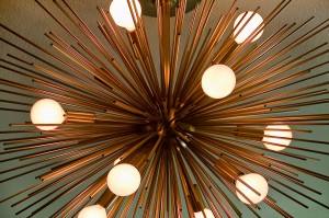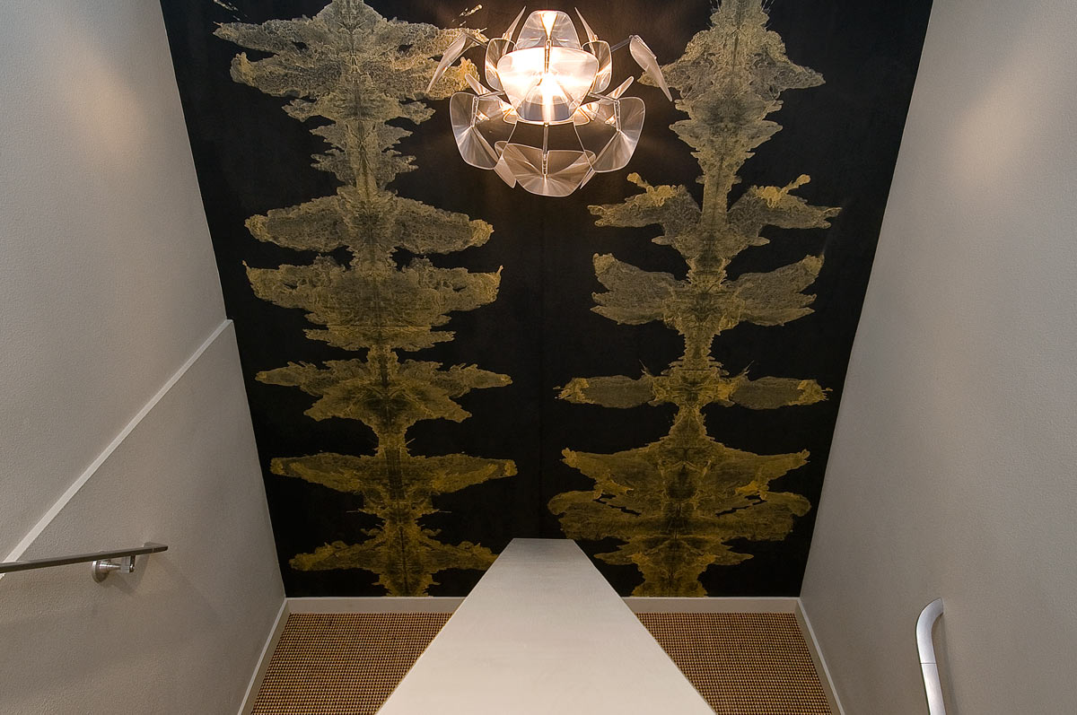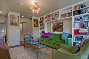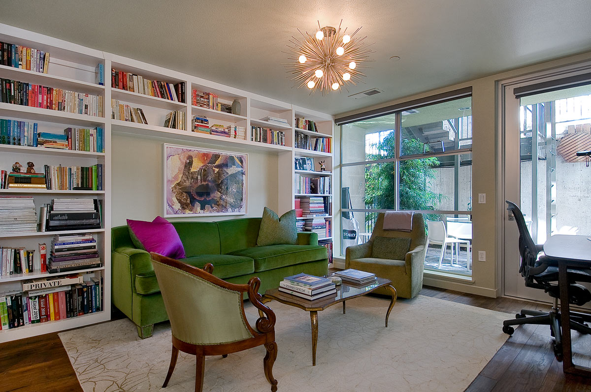 Step to the bedroom level of the home via a staircase that elegantly merges tradition with eclectic flair, appointed with sisal carpet, custom metal handrails and handmade Porter Teleo wallpaper. This level features two master suites, one with custom library, and both adjoining a private front patio showcasing a peaceful succulent garden designed and created by Crooked Nest Studios. Beautiful DuChateau wood floors, custom walk-in closets and Hunter Douglass window treatments complete this level.
